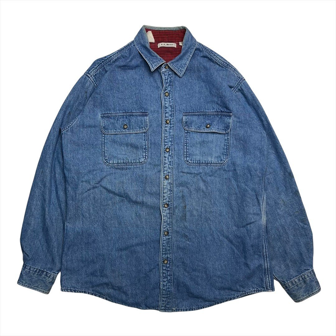 > 80s-90s Vintage エルエルビーン デニム シャツ 長袖 ブルー L L Bean 古着 メンズ L フランネル チェック ライナー付き 厚手 ヴィンテージ