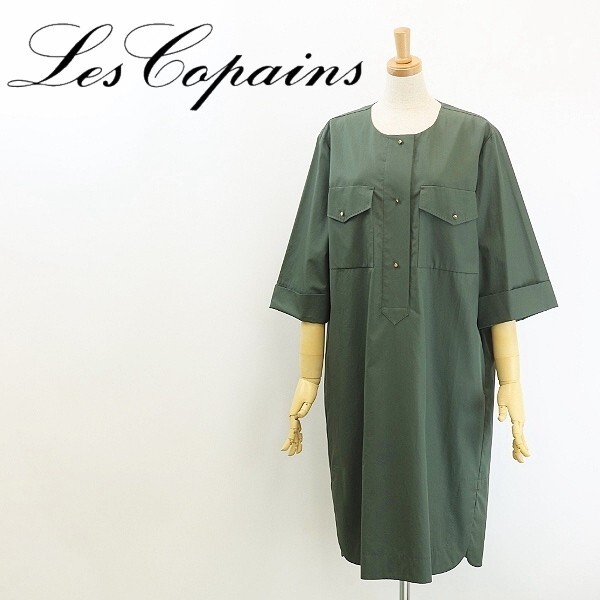 - ◆Les Copains レコパン コットン ハーフボタン 七分袖 サイドスリット ワンピース モスグリーン 44
