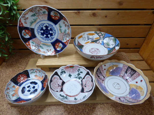 > ま845.【5点セット】レトロ 骨董品 盛鉢 深皿 色絵 松竹梅 輪花鉢 絵皿 焼き物 京都旧家蔵出し品