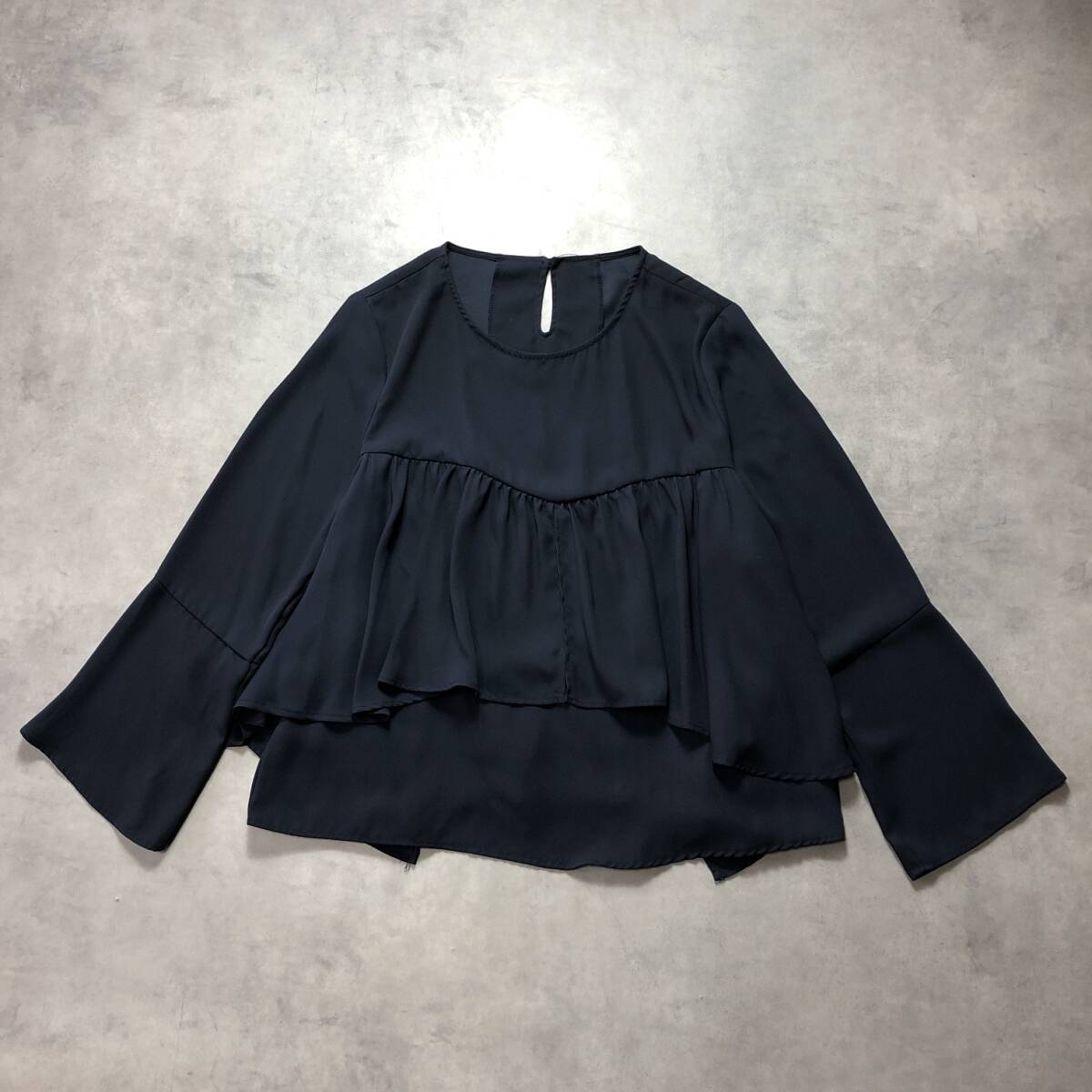 - WQ308●trois:後ろリボンペプラム重ねブラウス ●F● ネイビー Made in Japan フレア袖 トロワ
