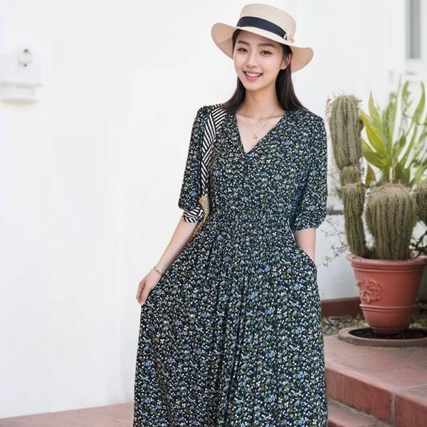 - mc 0705 半袖 ポケット ワンピース ゆったり オシャレ 裾広がる 通気性手触り抜群 肌に優しい ドレープ性 大人可愛 着丈120㎝ 柄83