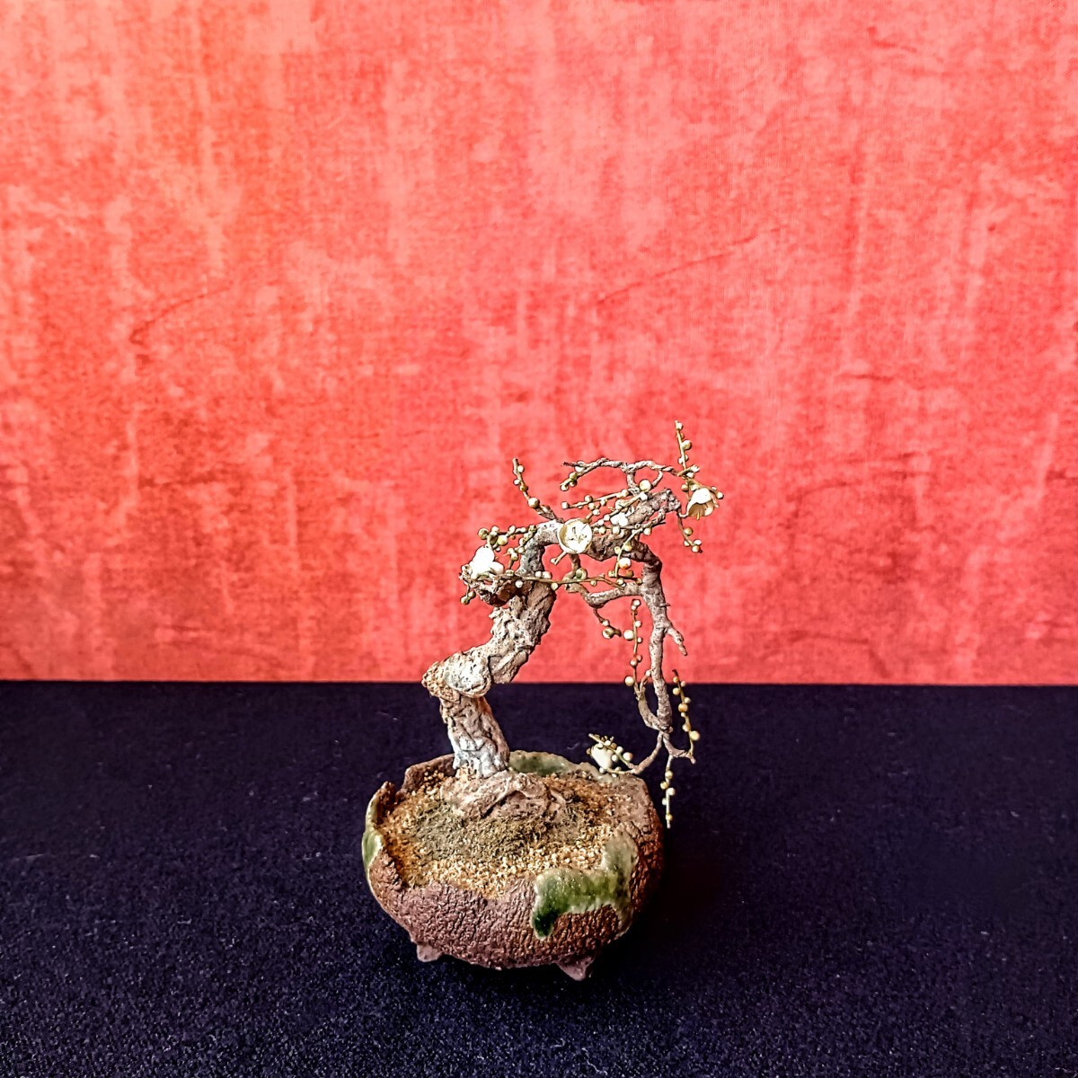 - 盆栽つくりもの◆梅の木◆鉢 在銘『薫』◆ミニ盆栽 飾り インテリア ミニチュア ぼんさい