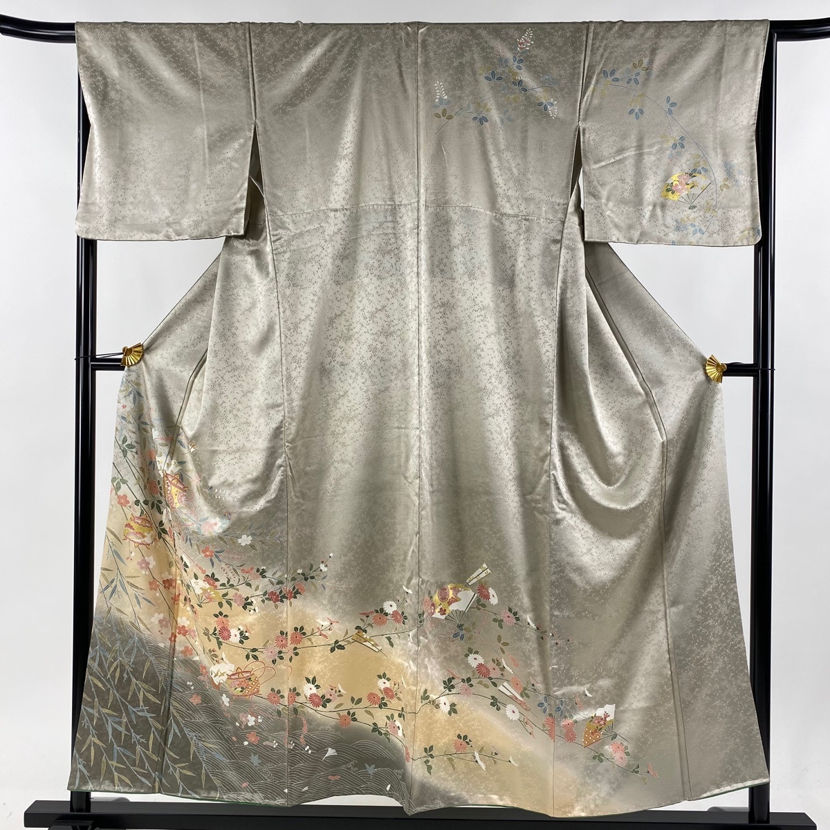 - 【在庫一掃】 訪問着 身丈154cm 裄丈66.5cm M 袷 糸巻き 草花 金彩 ぼかし 灰茶 正絹 秀品 【中古】