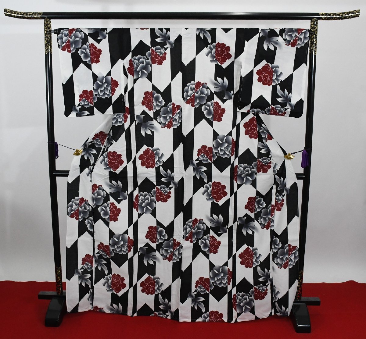 - 浴衣 女性用 着物 祭り 夕涼 矢羽根 黒白 花 夏祭り 金魚 花火大会 身丈163cm 裄丈68cm ★着物 u-353 桜庭呉服店