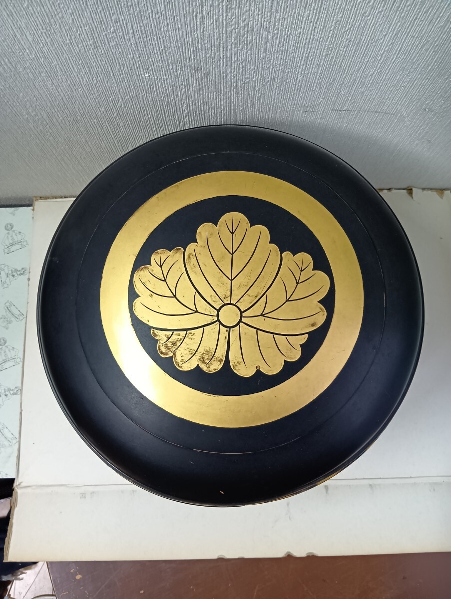 - おひつ 漆器 蒔絵漆器 江戸時代 家紋入 天然木 木製 金巻図柄 現状品