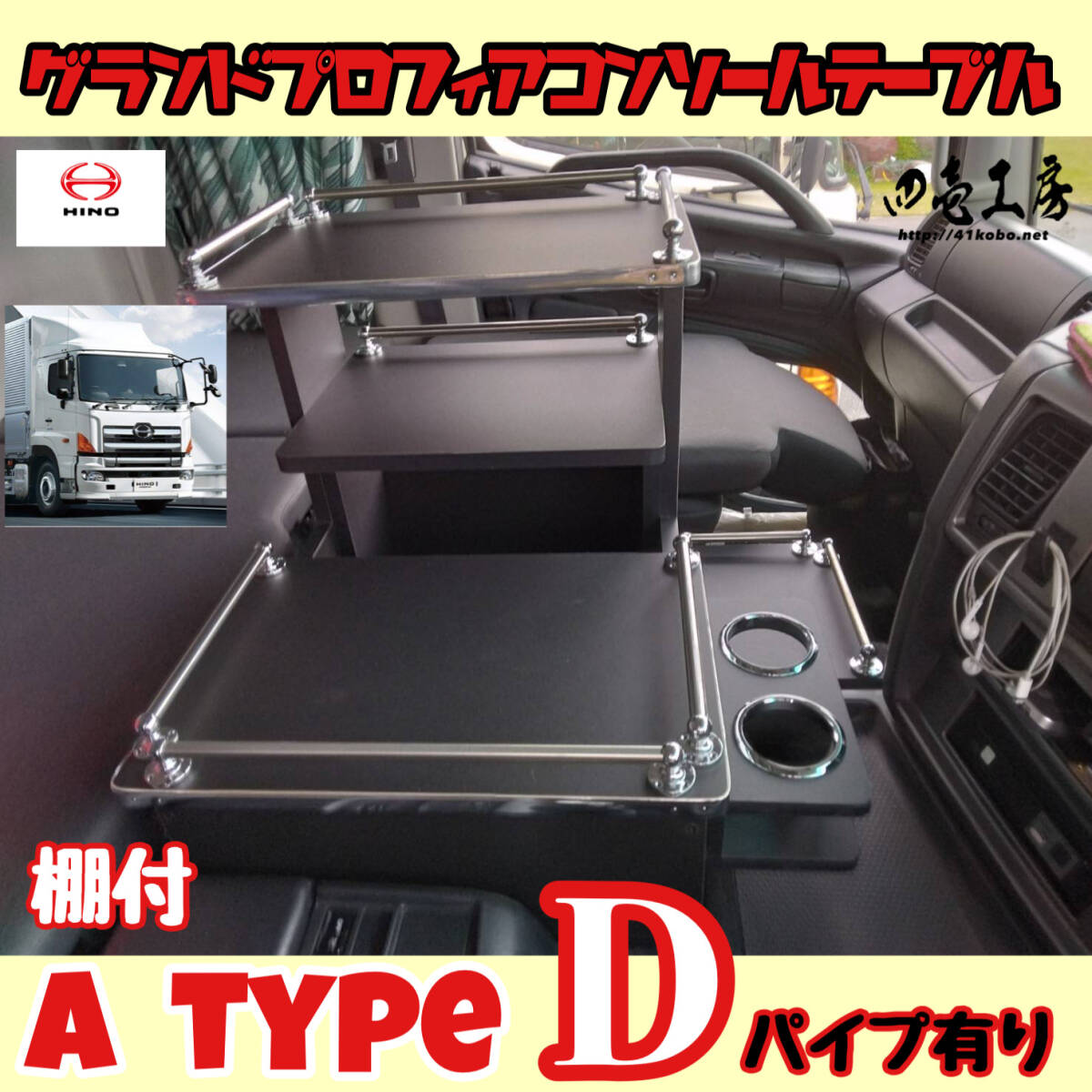 - 日野 グランド プロフィア 専用 センター コンソール テーブル 棚付き A type D ステンレスパイプ有り マーカー シフトノブ レトロ 長距離