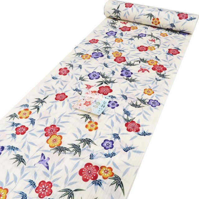 > 夏物 夏着物 浴衣 反物 着物 未仕立て 新古品 木綿 カジュアル 源氏物語 紅型調 花鳥模様 竹 梅 鳥 生成色 多色 きもの北條 A1200-3