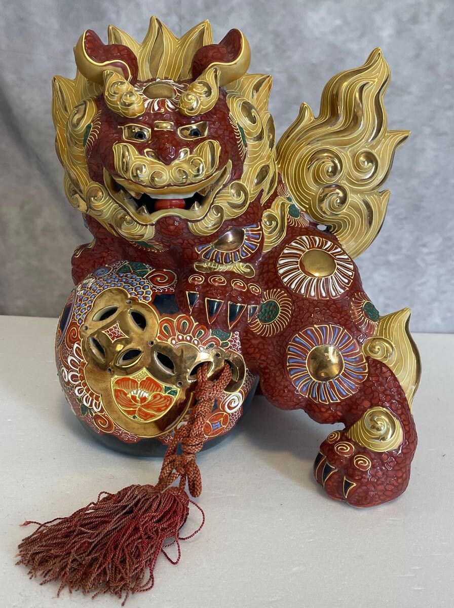 - 玉乗り獅子 九谷焼 八栄窯 須栄義 縁起物 魔除け 狛犬 シーサー インテリア オブジェ 盛 五彩