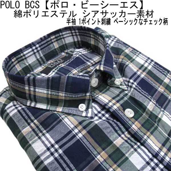 - 夏 POLO 半袖 綿サッカー/マドラスチェック柄BDシャツ 紺×緑 LL