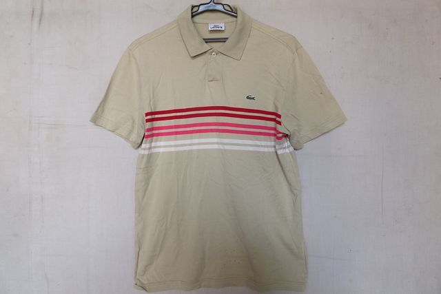 - LACOSTE/ラコステ/襟付半袖シャツ/Tシャツ素材/赤・ピンク・白ラインプリント/ロゴししゅうワッペン/アイボリー/ベージュ/サイズ3(6/5R7)