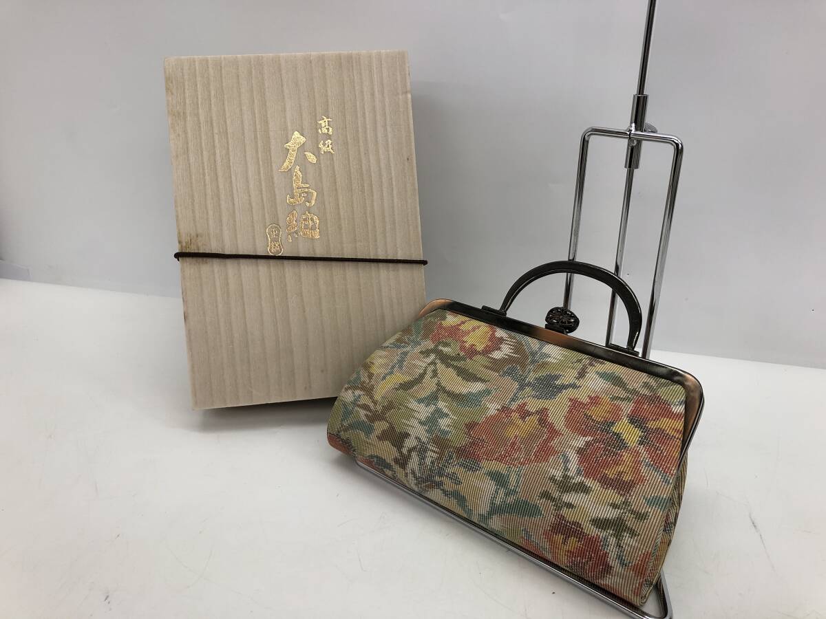 - 大島紬 バッグ ハンドバッグ 絹 絹織物 和装バッグ 冠婚葬祭 着物 がま口 和装小物 花柄 総柄 木箱入り 鏡付き