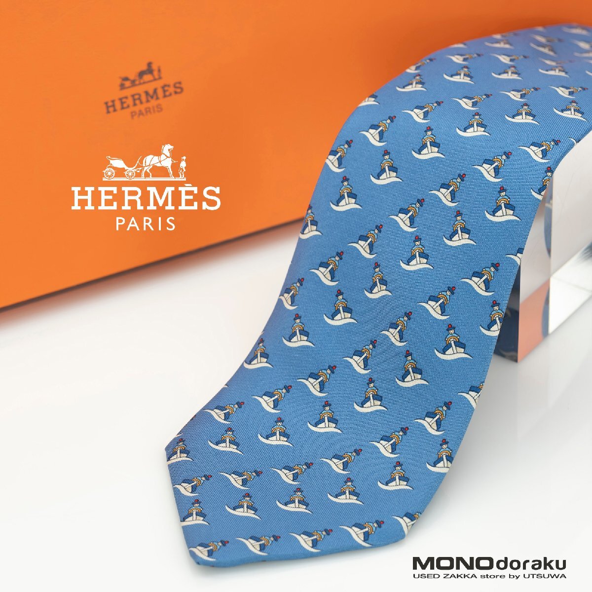 - エルメス HERMES メンズアクセサリー シルクアイテム ネクタイ ボートモチーフ 5239 SA 総柄 ブルー