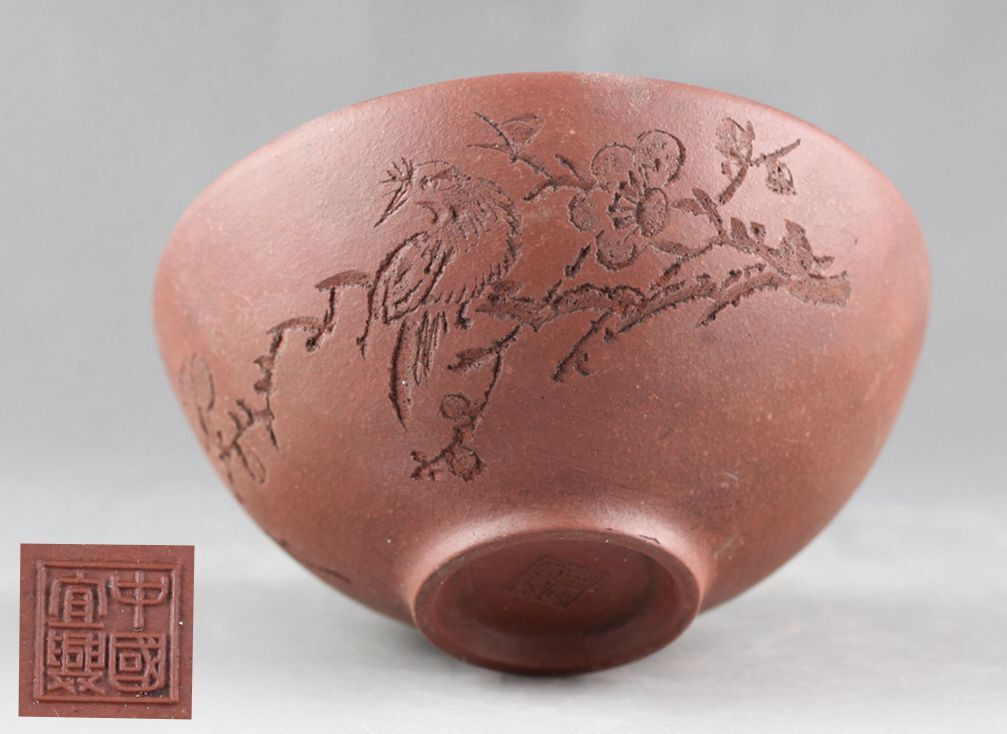 - 中国美術 中国宜興款 紫砂 朱泥 梅花鳥漢詩文 茶碗・珍品旧蔵・古賞物・時代物