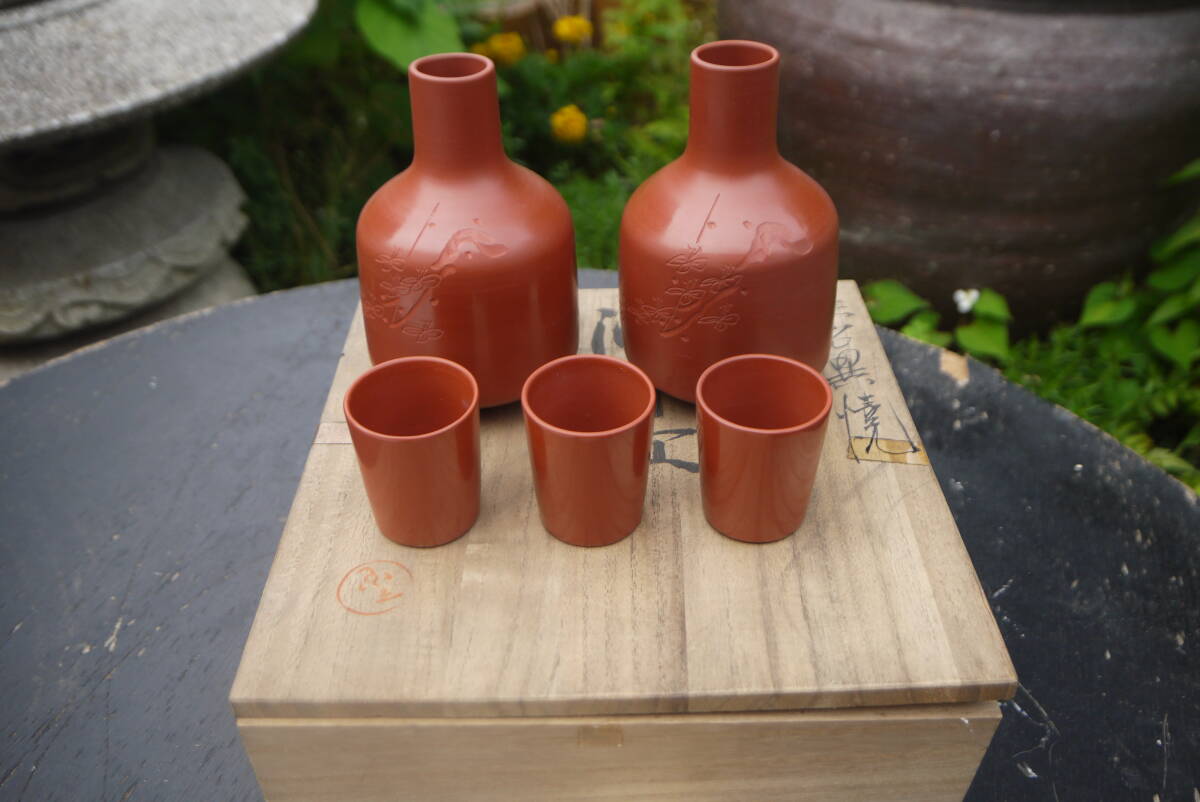 - ★【5Jun06 羽】佐渡 無名異焼 國三窯 渡辺國三 朱泥 酒器セット 徳利2ヶ お猪口3ヶ 未使用品