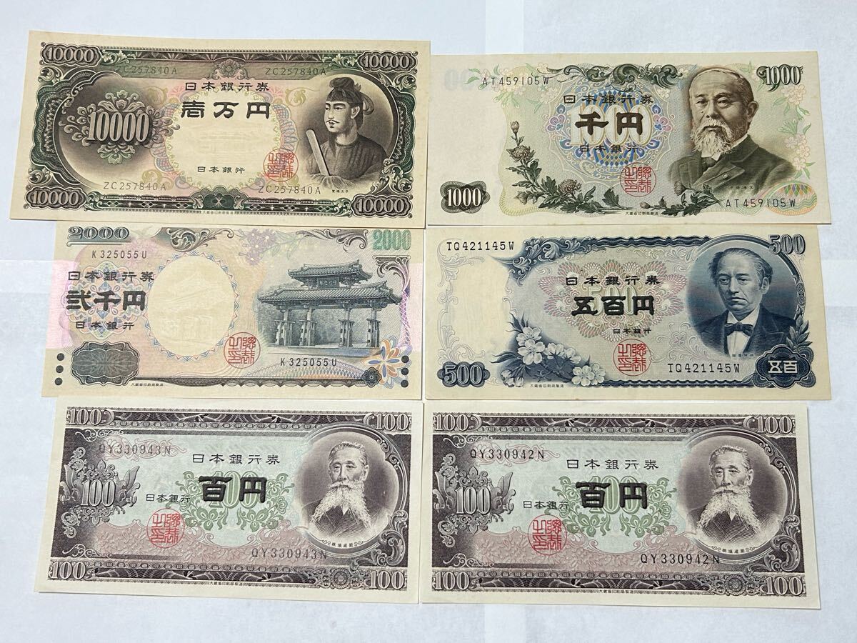 - ★未使用品★ 旧紙幣聖徳太子一万円、守礼門二千円、伊藤博文千円、岩倉具視五百円、板垣退助百円2枚連番ピン札六枚セット