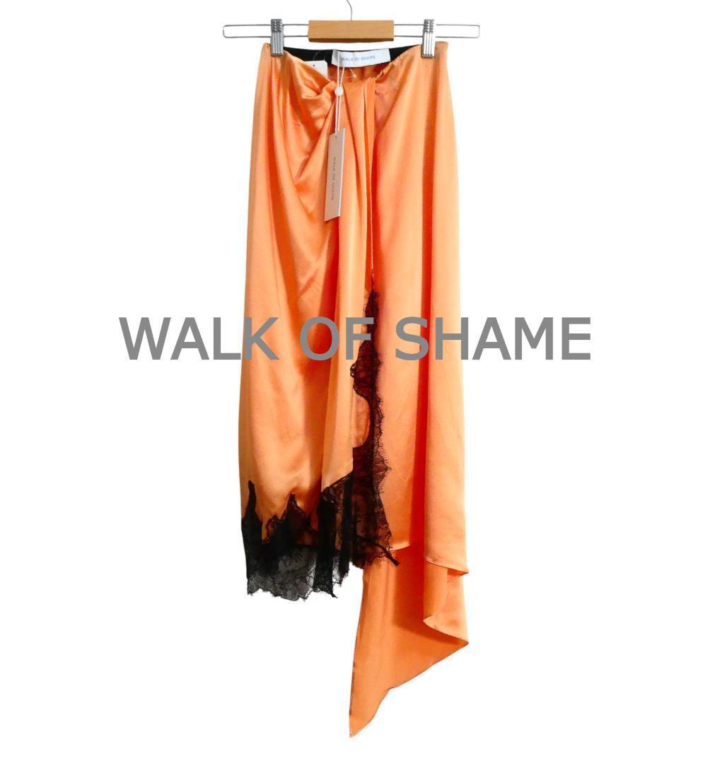 > 新品同様 WALK OF SHAME ウォークオブシェイム サイズ40 シルク100% レース アシンメトリー ロング スカート オレンジ