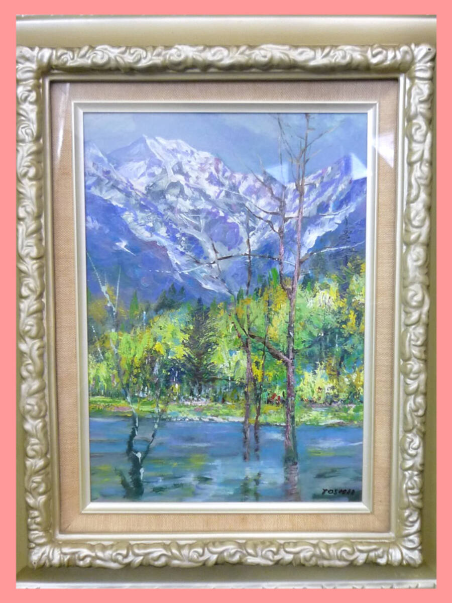 > 「真作」吉井靖治 上高地 大正池 油彩 額縁 フレーム 絵画 額入 人気 木目調 ヨーロピアン風額 美品 インテリア お買得 レア 必見