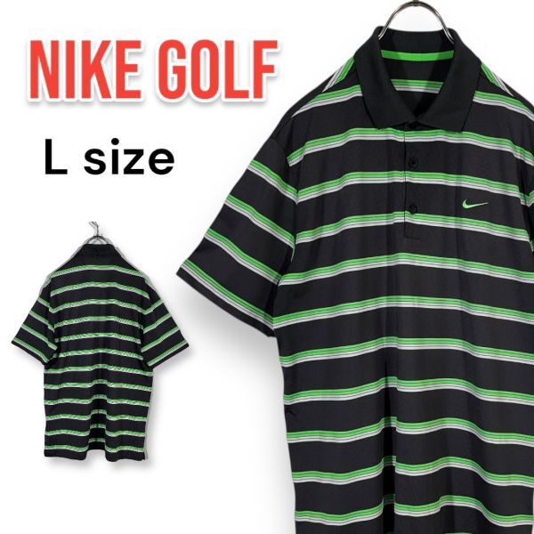 > NIKE GOLF ナイキゴルフ 刺繍ロゴ 半袖 ボーダー ポロシャツ Lサイズ メンズ ブラック/グリーン ゴルフウェア 速乾性 収縮性