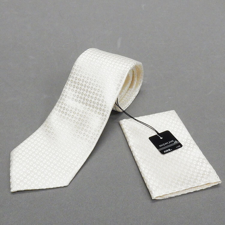 > 西陣織 フォーマルタイ チーフ付 白系 かわりバスケット柄 シルク100%◇日本製 礼装 白 ネクタイ 結婚式 披露宴 メール便可 njc59-WH