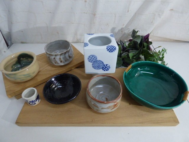 - み89【7点セット】茶道具 抹茶碗 菓子鉢 蓋置 角型水指 石山 仁楽 コレクション 茶碗