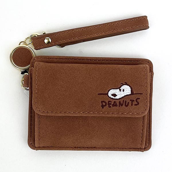 - スヌーピー パス&コインケース ブラウン デスク刺繍 リール付き ICカードケース 定期入れ