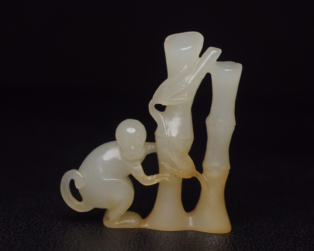 - 『館蔵珍品 和田玉製 細密彫 靈猴抱竹 置物 賞物』稀少珍蔵品 古賞物 貴重物品 収蔵品 中国古美術 時代物 古董品