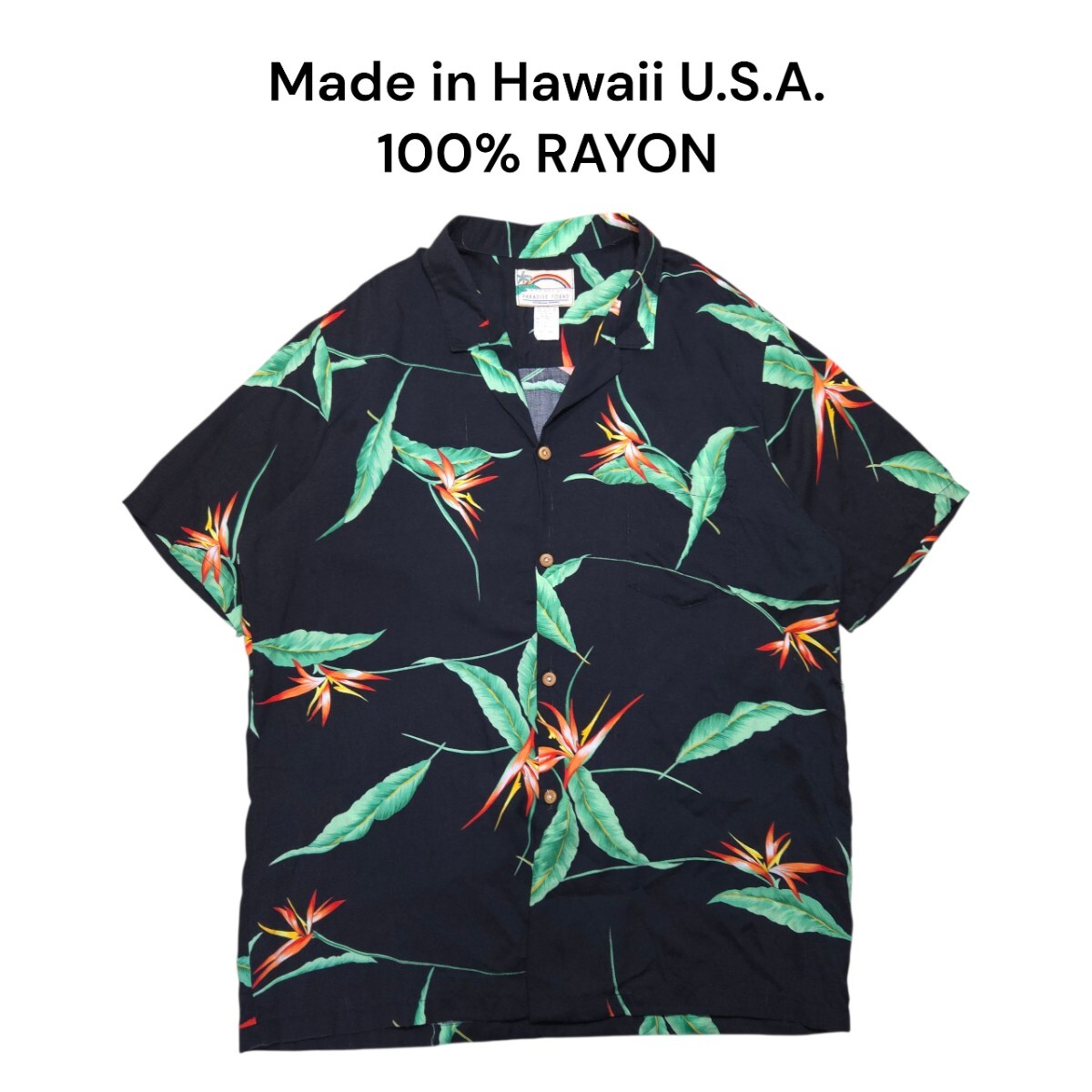 - USA製 レーヨン100 総柄アロハシャツ オープンカラー ブラック 開襟シャツ