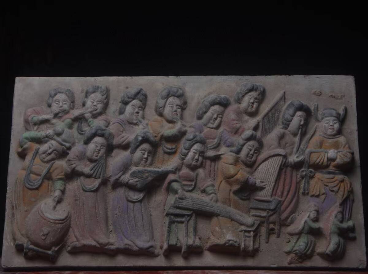 - 秘藏 唐代 盛唐~老煉瓦彫刻彩色楽女坊図 書道具 文房具 時代物 中国古美術 細密彫 置物 賞物 唐物 文玩 希少珍品 5.17