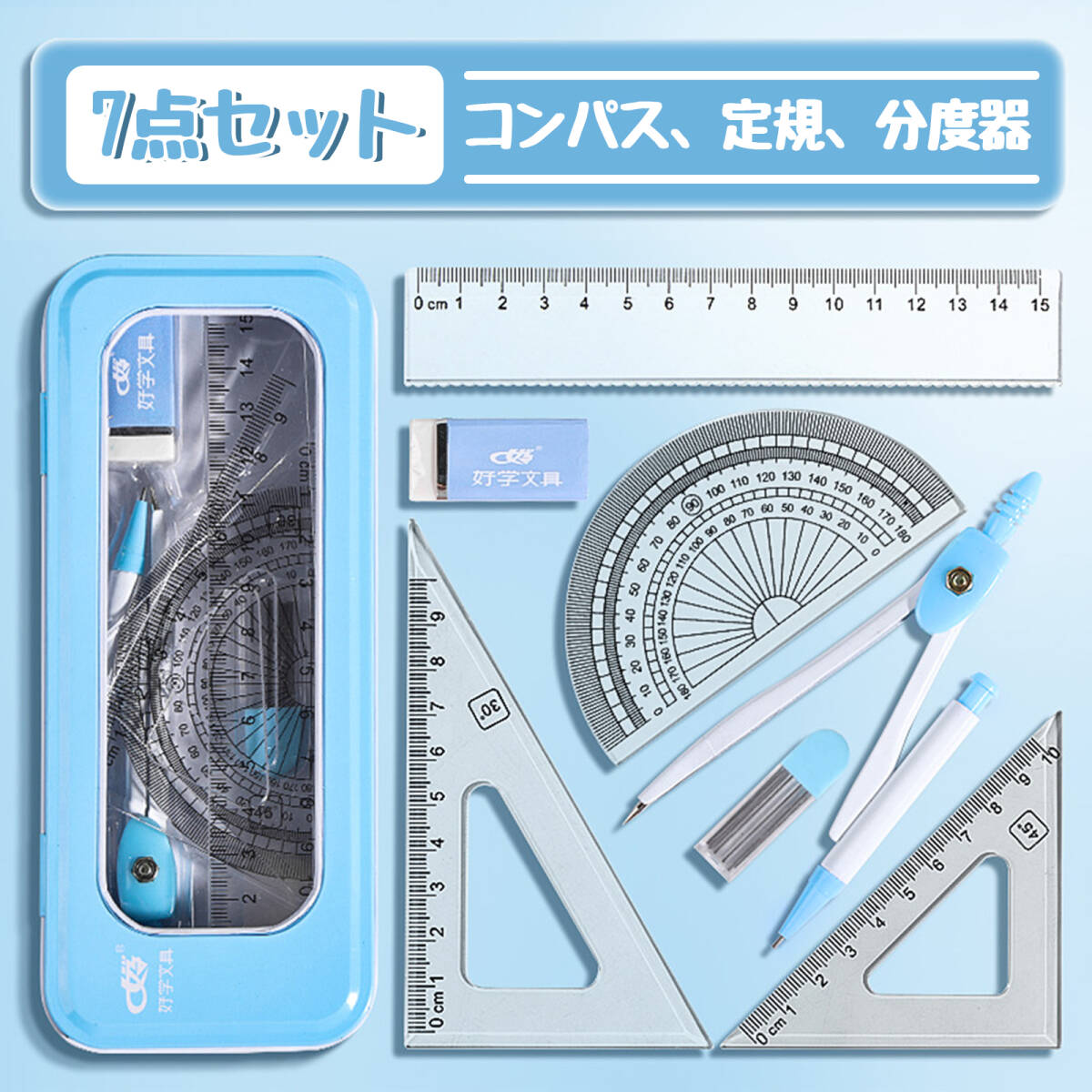 - コンパス 三角定規 分度器セット(7点セット)- コンパクト&リーズナブルなデザイン(あお) ;J5457;