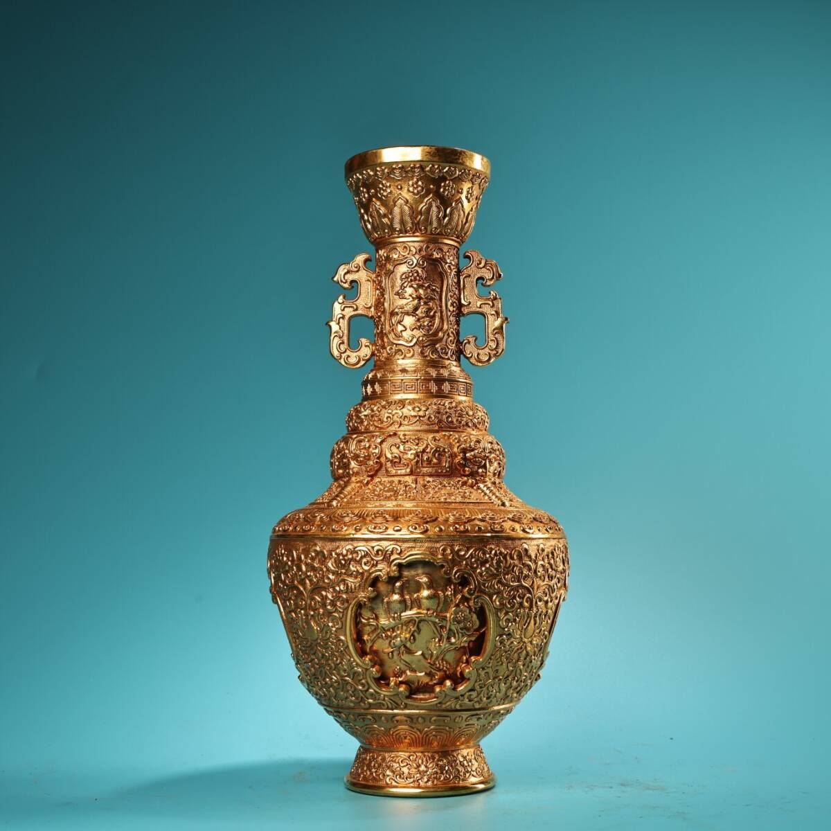 - 【超珍館蔵】銅製 塗金 梅蘭竹菊紋 花瓶 置物 賞物 古賞物 古董品 古美術品 時代物 旧家蔵出 稀少珍蔵品