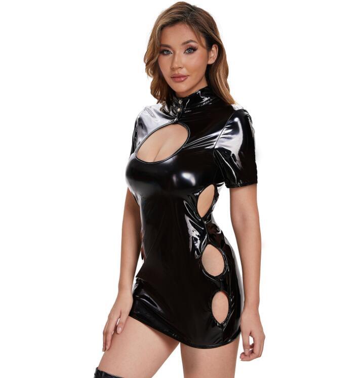 - YT0618 レディースワンピース☆ 大人sexy 合皮 ☆ 可愛い 素敵 ミニ丈 半袖 黒