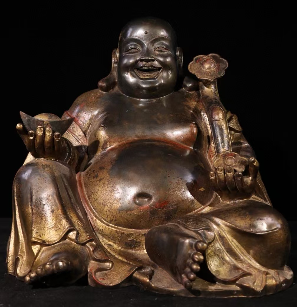- 仏像 清代 旧蔵 チベット古寺 古銅蒔絵朱砂仏像【宝袋弥勒仏】 銅製 銅琉金 唐物 收蔵品 時代物 古置物 希少珍品 供養品 文房具 仏教6.17