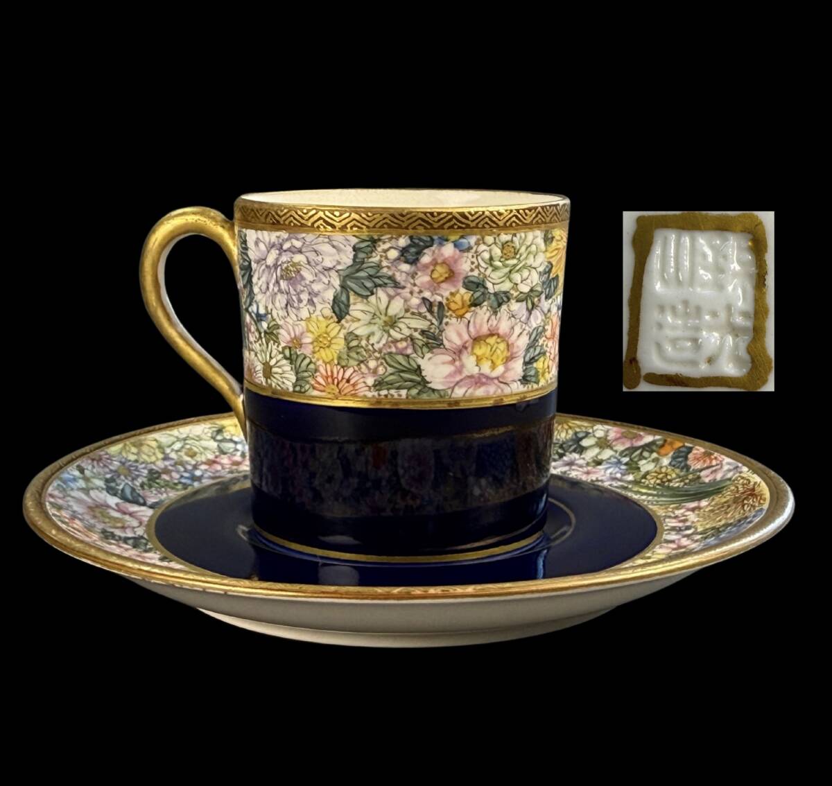 - 【偲】明治期 里帰り 薩摩 錦光山 百花繚乱 キャビネットカップ ソーサー 金彩 コバルトブルー c-174