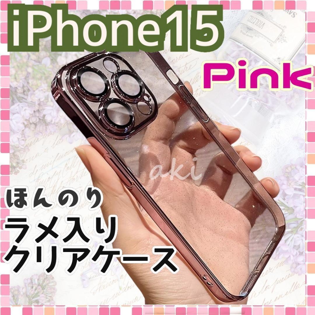 - iPhone15 ケース クリア メタリック レンズ保護 ほんのりラメ ピンク