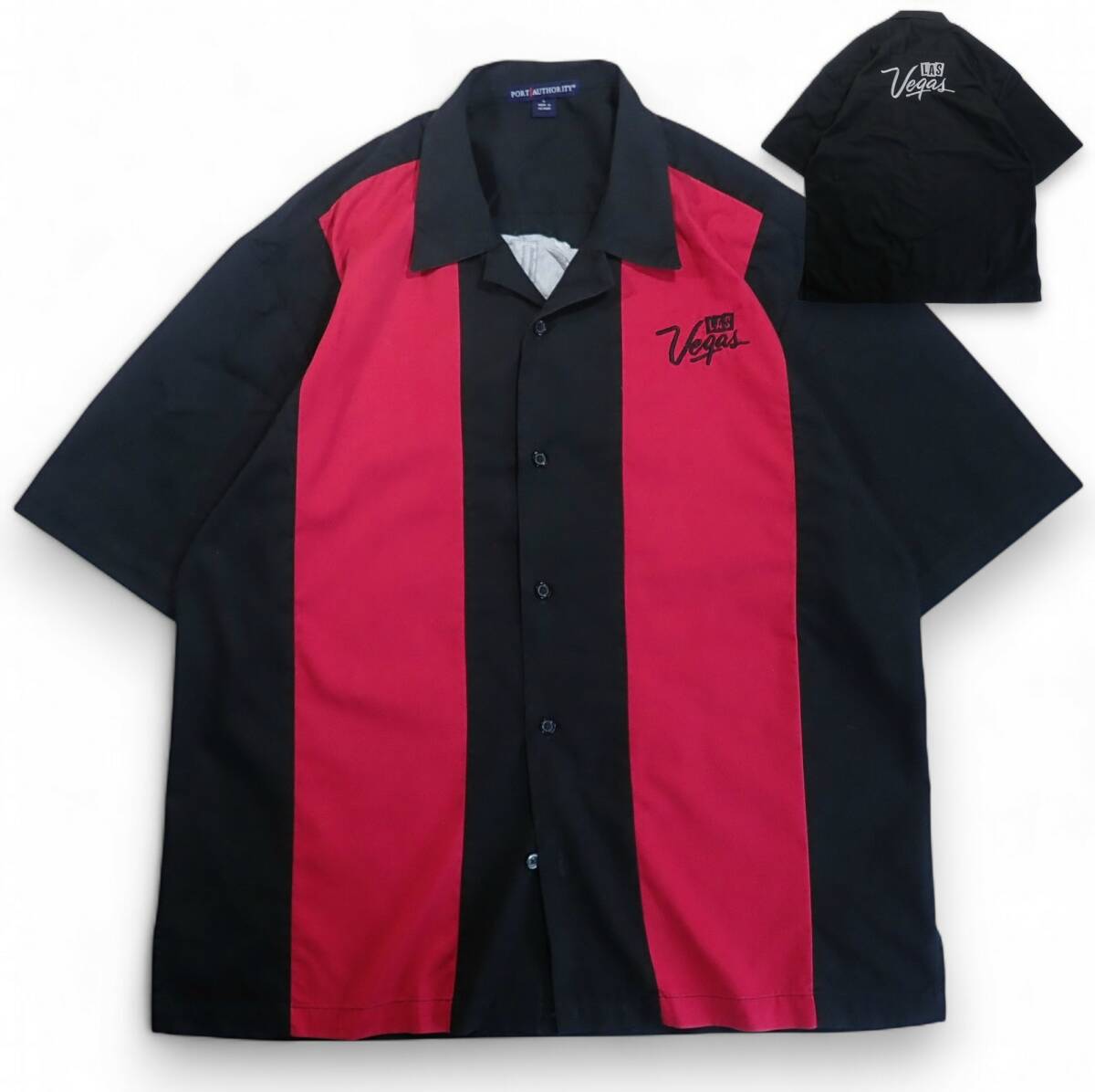 > 6770/良好 PORT AUTHORITY 半袖オープンシャツ L●ワーク ボーリング 切り替えしLAS Vegas刺繍 ロカビリーRock'n'Roll●洗濯プレス済●古着