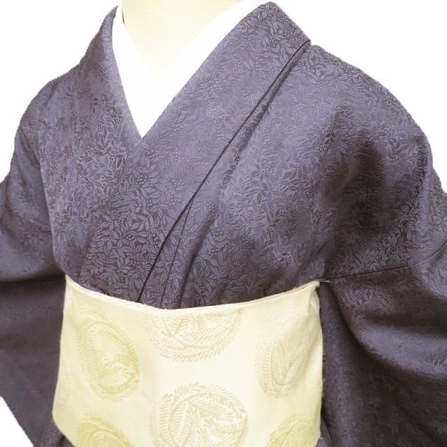 - 色無地 着物 中古 正絹 袷 カジュアル 紋なし 地模様 南天模様 紫鼠色 身丈158cm 裄64cm M きもの北條 A1219-3