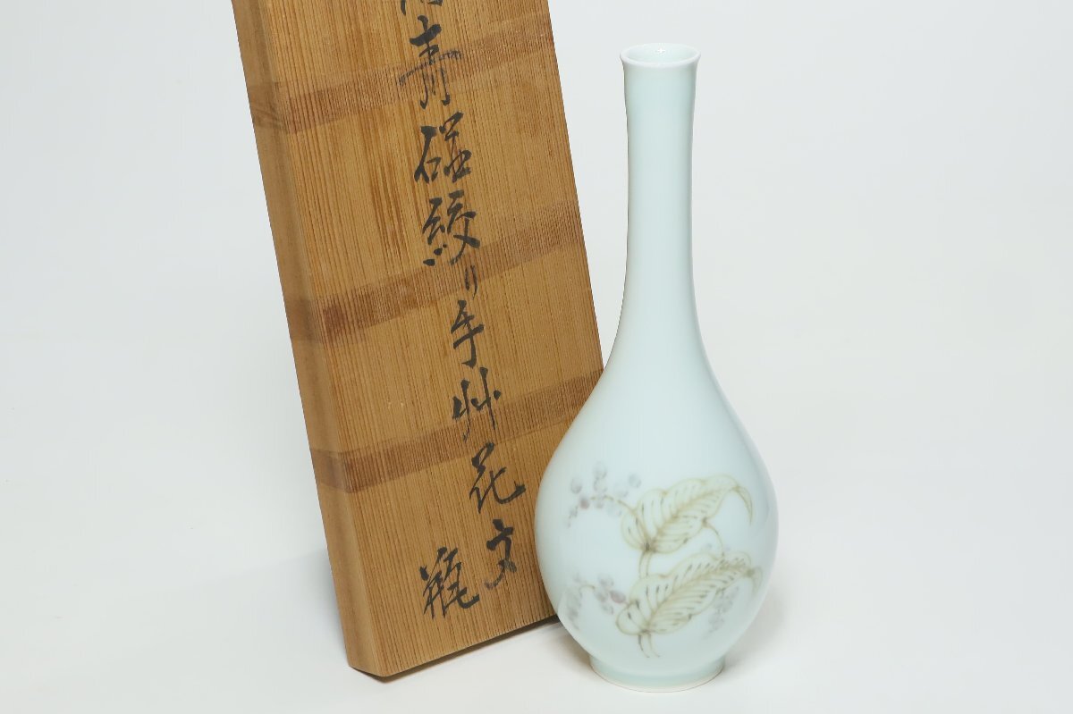 ・年木庵 松本佩山 薄青磁絞り手花文 瓶 共箱 /有田焼 青瓷 壺 花瓶 花器 鶴首 |