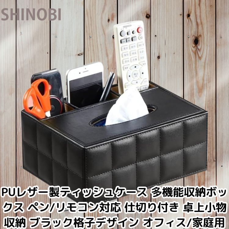 > PUレザー製ティッシュケース 多機能収納ボックス ペン・リモコン対応 仕切り付き 卓上小物収納 ブラック格子デザイン オフィス・家庭用