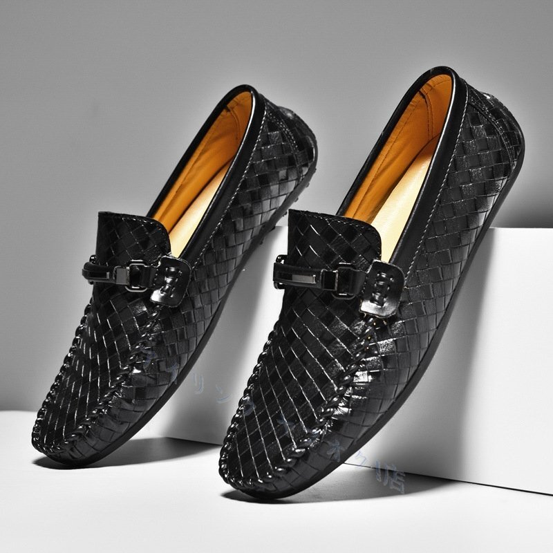 - ローファー スリッポン 編み込み ドライビングシューズ 本革 革靴 メンズ ウォーキング 牛革スニーカー 紳士靴 ブラック