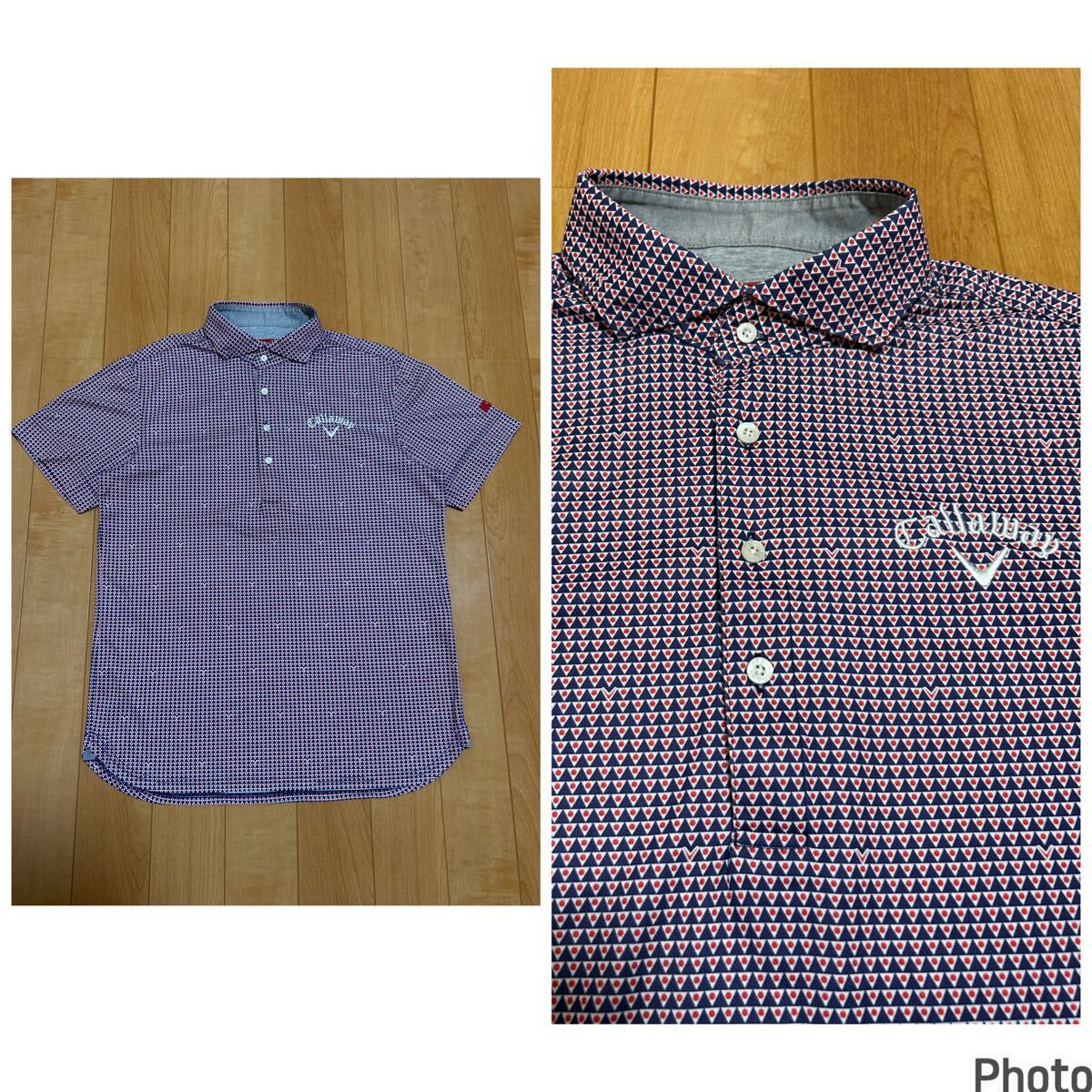 - 美品☆Callaway/キャロウェイ メンズサイズLL 快適速乾ドライ.半袖ポロシャツ 全面日の丸調ドット&ロゴ総柄・マーク刺繍入&パッチ.マチ付