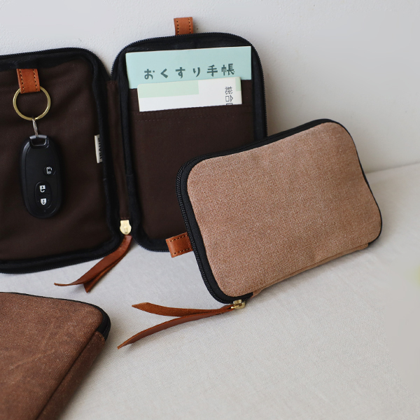 - 新作 Lサイズ 古布リメイク 酒袋 柿渋染め クッション入り キーケース カードケース ポーチ 牛革レザー S13A