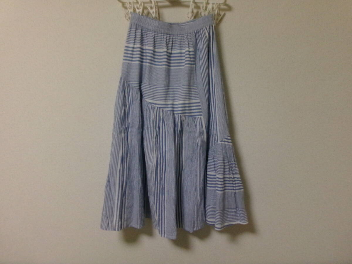 - AMERICAN HOLICアメリカンホリック☆青ブルー水色×白のパッチワーク風 切替ストライプ柄☆ふんわり♪フレアロングスカート☆Fサイズ☆美品