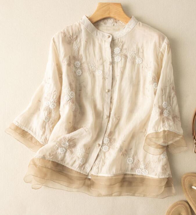 > 人気 新品ブラウス レディース 七分袖シャツ 綿麻シャツ チュニック 刺繍 上品トップス オシャレ 開襟 きれいめ 通気性M~XXL
