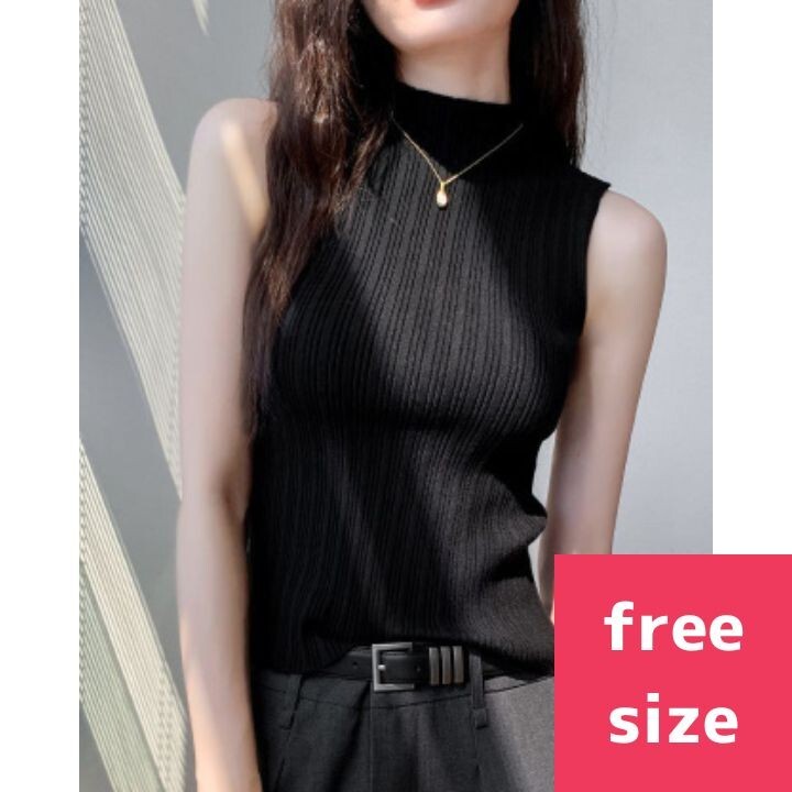 - レディース ノースリーブ お洒落 リブニット 大人 ハイネック カジュアル 黒