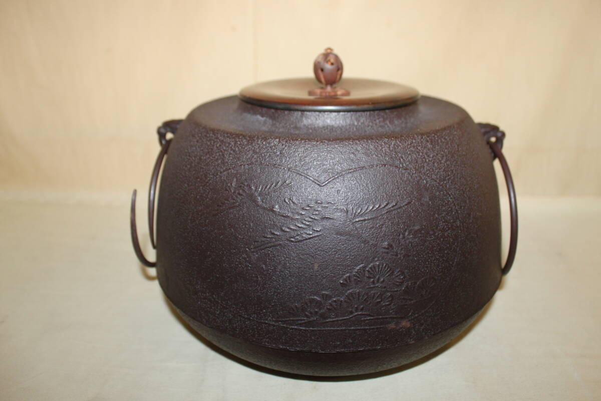 - ●茶道具 釜師 紹慶作 松鶴地紋 田口釜 間取 唐銅蓋 釜鐶/共箱