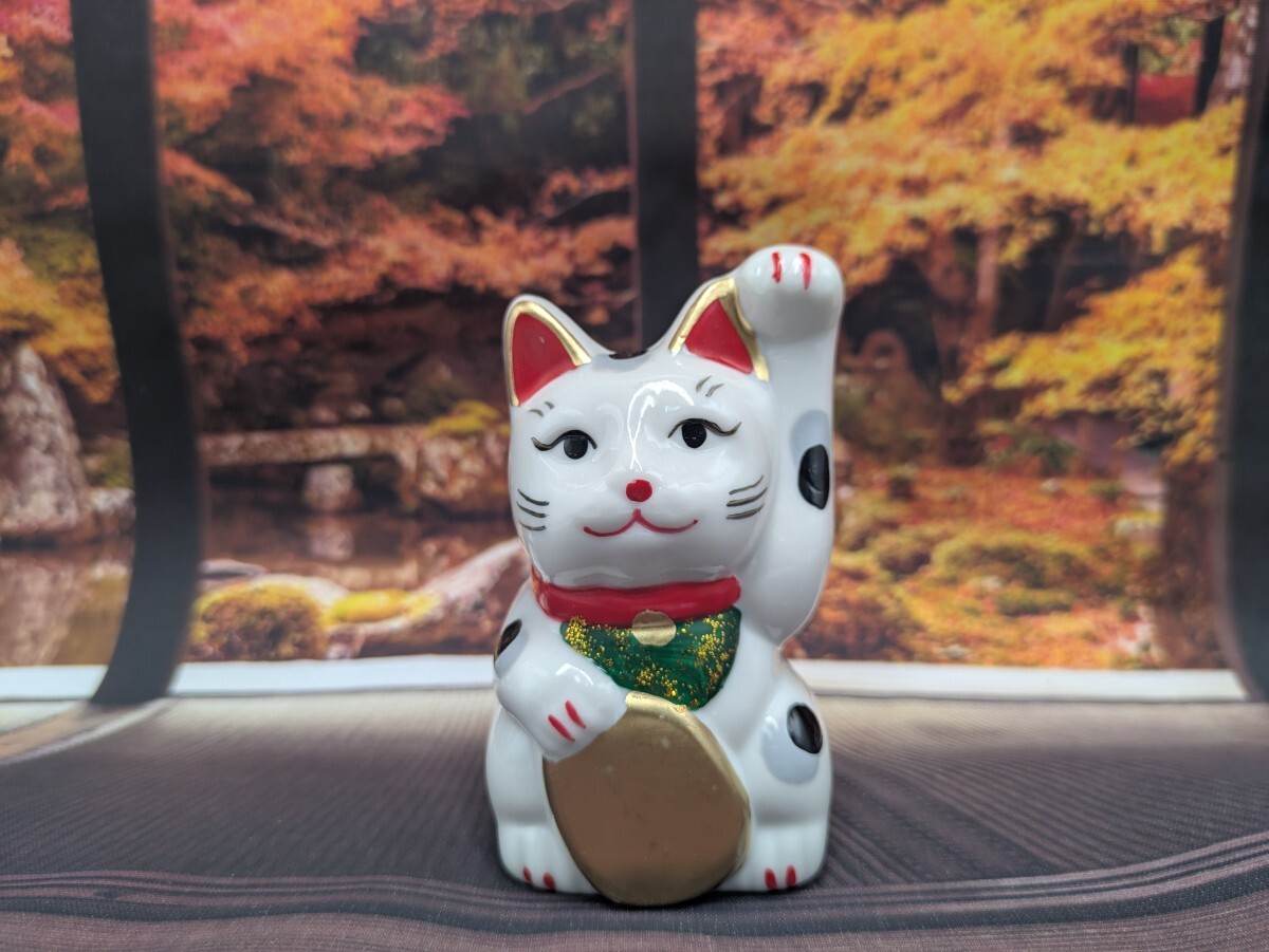 - 招き猫 縁起物 瀬戸焼 左手上げ 磁器小招猫 ぶち猫