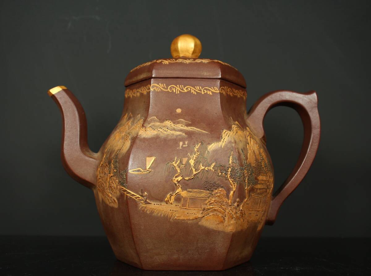 - 中国美術 清時代 【乾隆御製】 在銘 「綵絵堆金四方宮廷御酒壺」 紫泥 煎茶 急須 茶道具 唐物 時代物