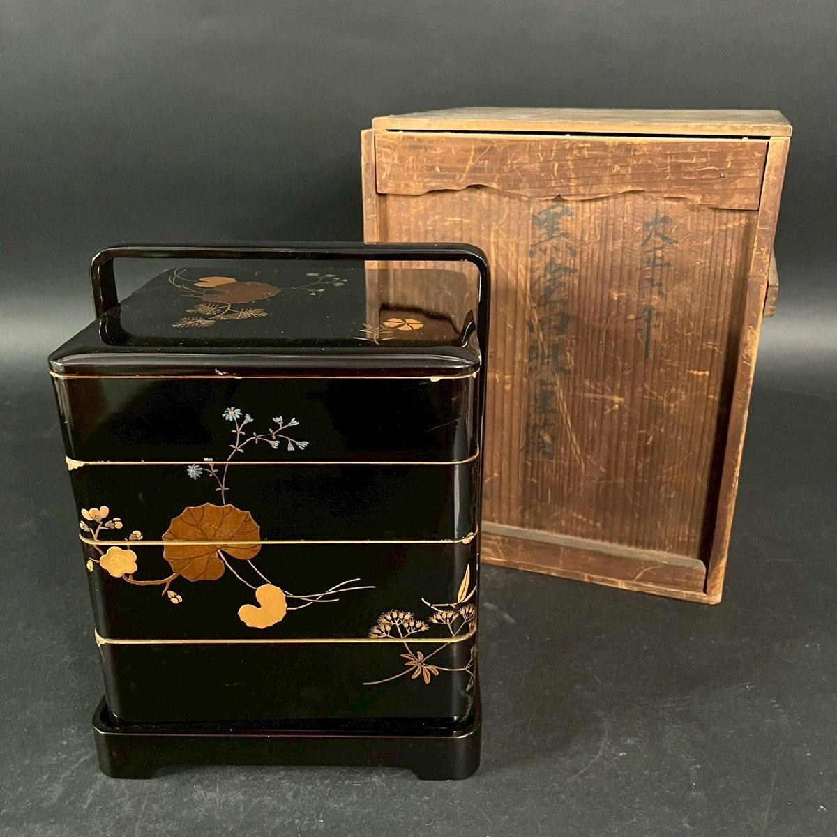 > SW0609-26-3 黒塗 四組 重箱 漆器 弁当箱 箱 段 食器 和食器 伝統 工芸 お祝い 大正 宗村氏 共箱 高さ24㎝ 横幅19㎝ 奥行19㎝ 100サイズ