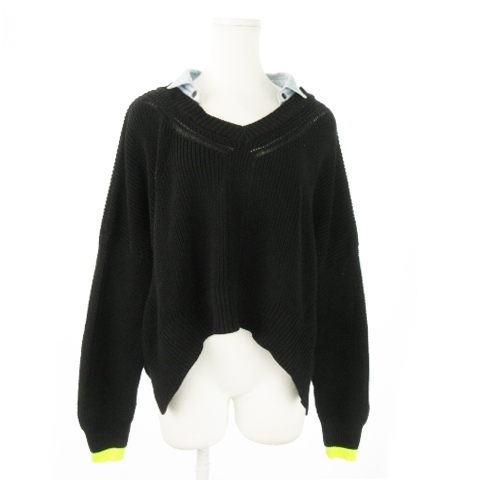 - ディーゼル DIESEL ニット セーター 襟付き Vネック 長袖 レイヤード デニムシャツ ロゴ 配色 S 黒 ブラック /AO16 ■GY18 レディース