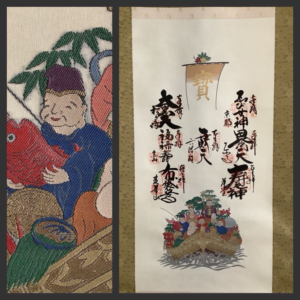 - 刺繍掛軸Jul702B[都七福神 宝船図]絹本 木箱/仏画 仏教美術 恵比寿大黒天毘沙門天弁財天福禄寿寿老人布袋 京都 縁起物 守護神